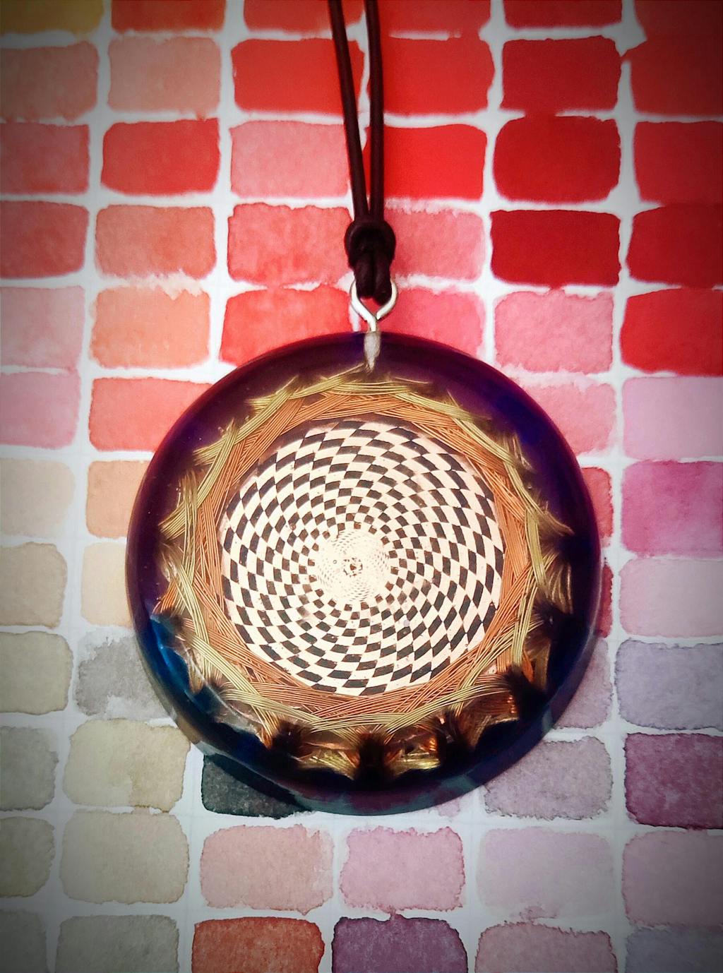 The Metayantra Cosmic Sensor Pendant is crafted from a laser-engraved copper plate and features an innovative energy coil made of copper and brass with 16 vortices. These vortices work together to generate a complex multidimensional toroidal field, seamlessly integrated into the sensor's geometry.